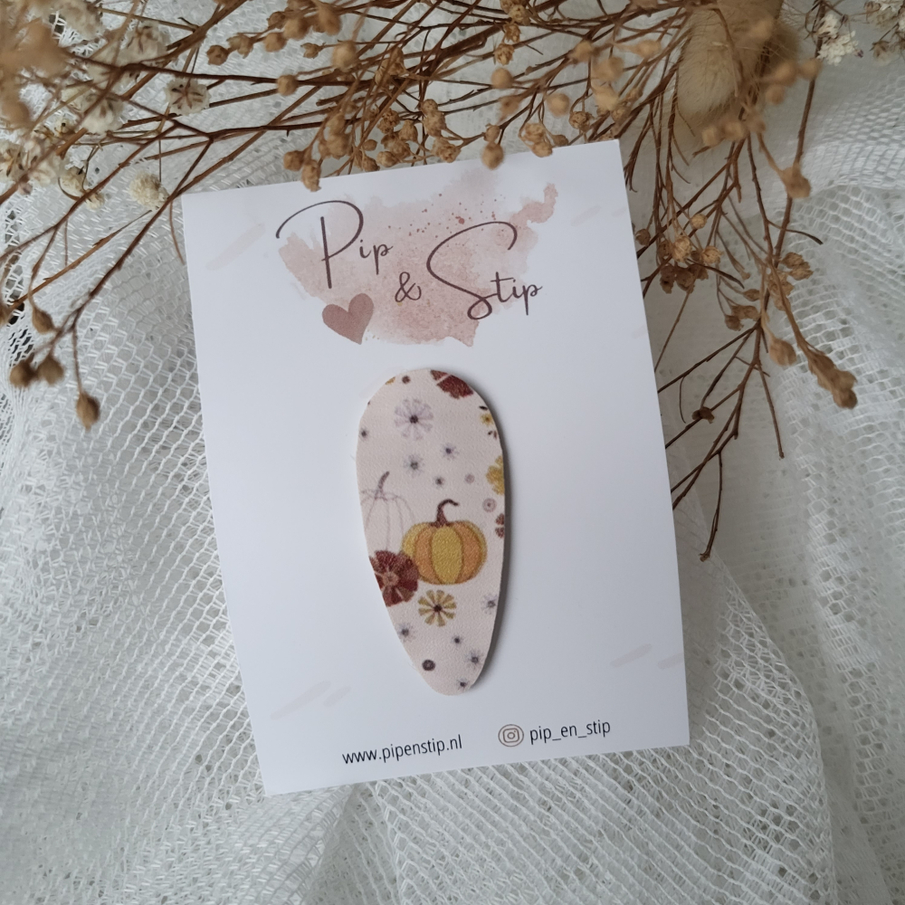Een haarspeldje van lederlook met pompoen print.