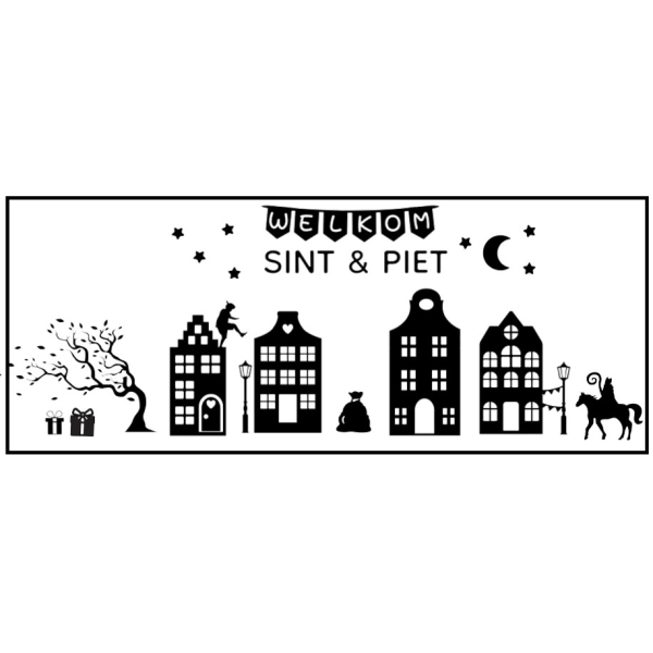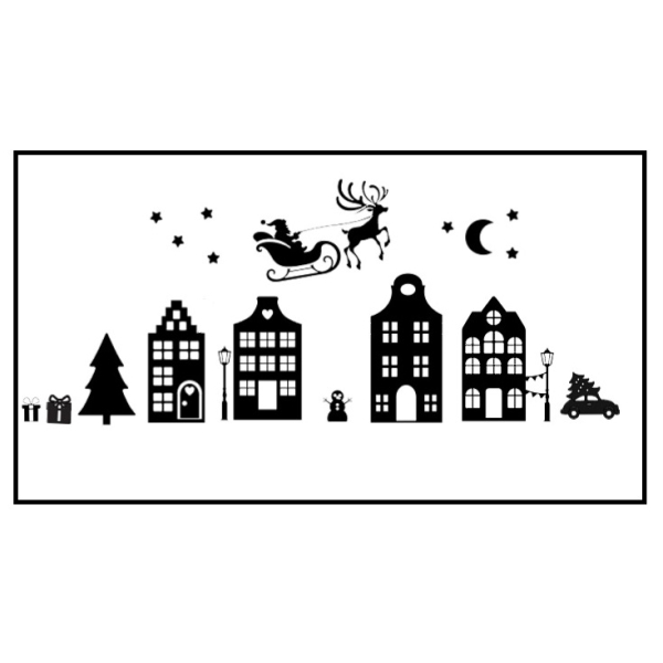 Breng sfeer in huis met herbruikbare raamstickers van statisch folie. Start met een straatje van 4 huisjes (15–20 cm), 2 lantaarnpalen, sterren en de maan. En breid uit met een thema (toevoegen bij de opties). Makkelijk te plakken, los te halen en jaar na jaar opnieuw te gebruiken!