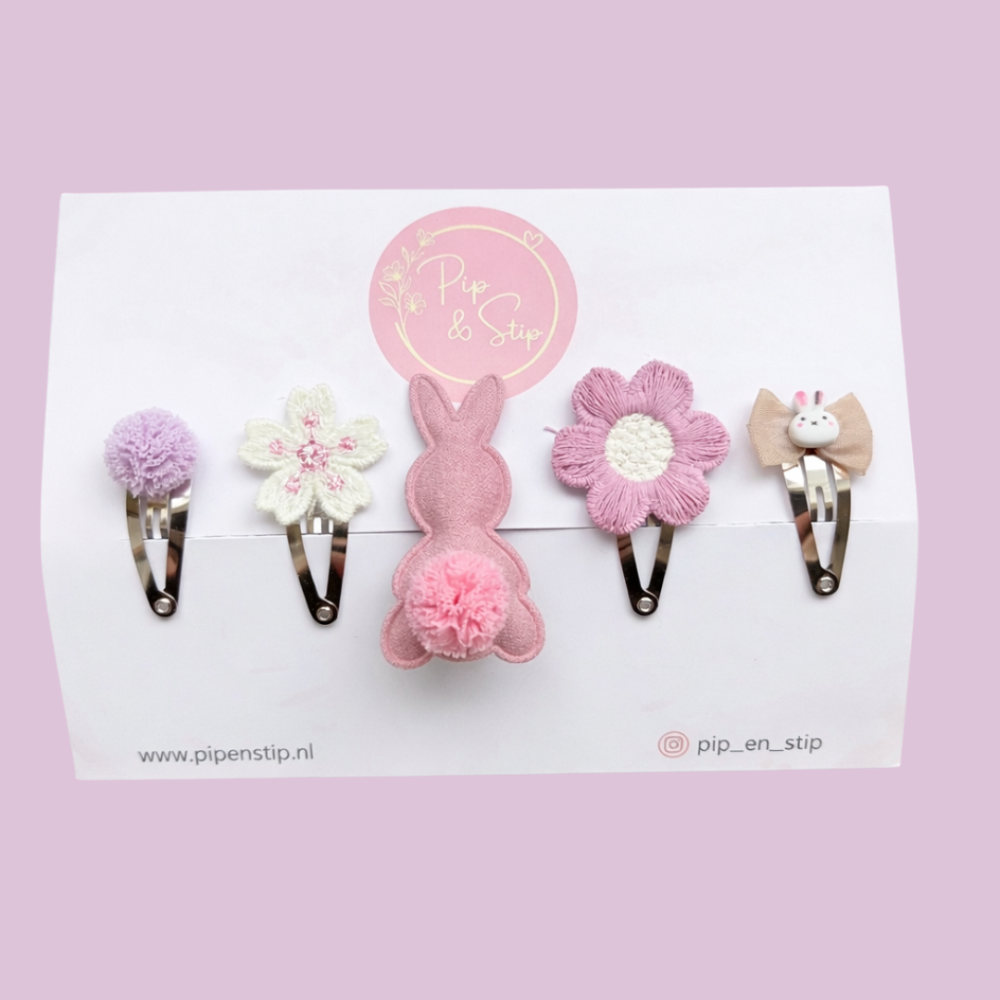 Dit lieve setje bestaat uit 5 handgemaakte haarspeldjes en is speciaal samengesteld voor Pasen. De vrolijke pastel tinten geven elk kapseltje een zachte en vrolijke uitstraling.
