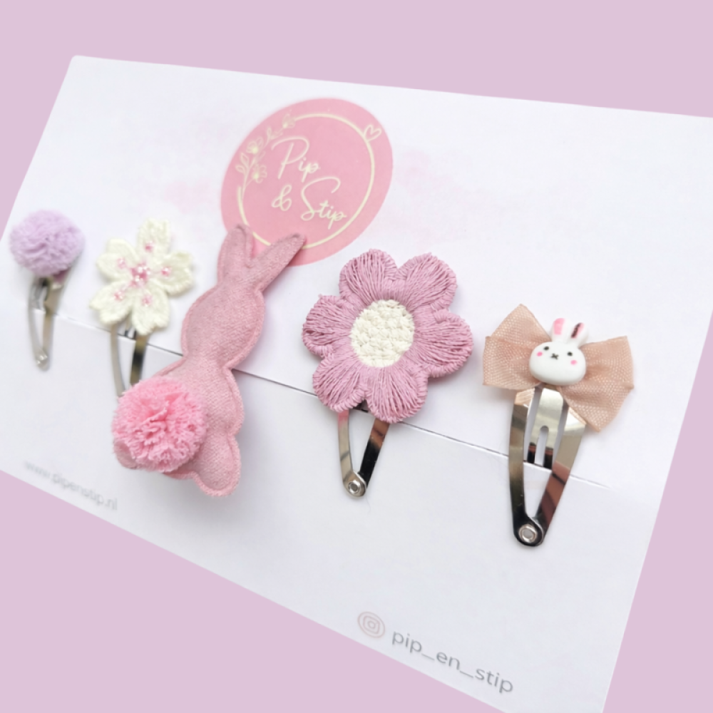 Elk haarspeldje is met zorg gemaakt en uniek in zijn soort. De speldjes zijn ongeveer tussen de 3,5 en 4,5 cm groot in maat mini en 5 á 5,5 cm groot in maat maxi en daardoor perfect geschikt voor baby en kinderhaartjes. Het Paashaasje zit op een alligatorspeldje en de andere speldjes zijn klikklak speldjes.