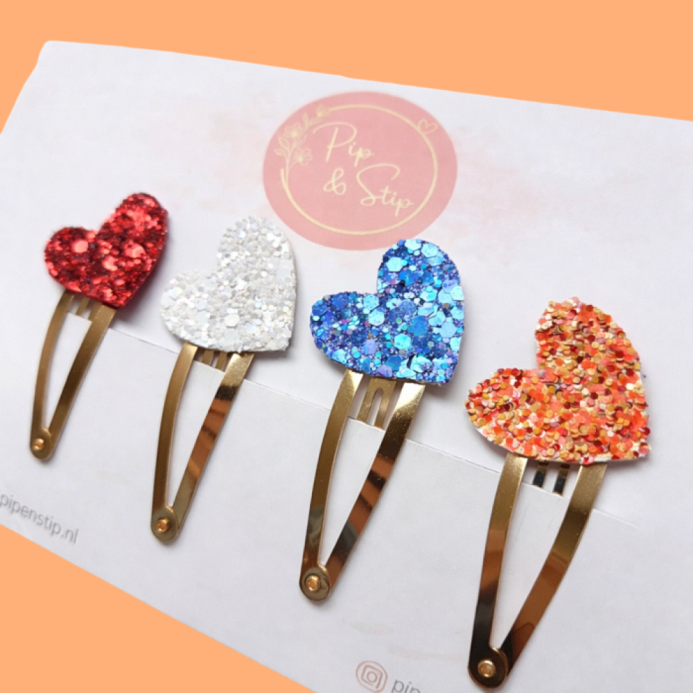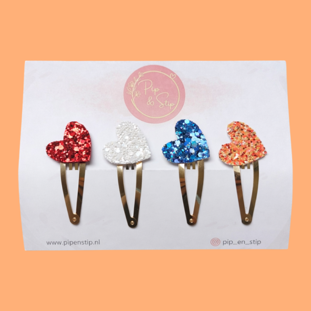 In dit setje vind je vier lieve speldjes met glitter hartjes in de kleuren rood, wit, blauw en oranje. Leuk om los te dragen, maar ook om meerdere in het haar te doen.