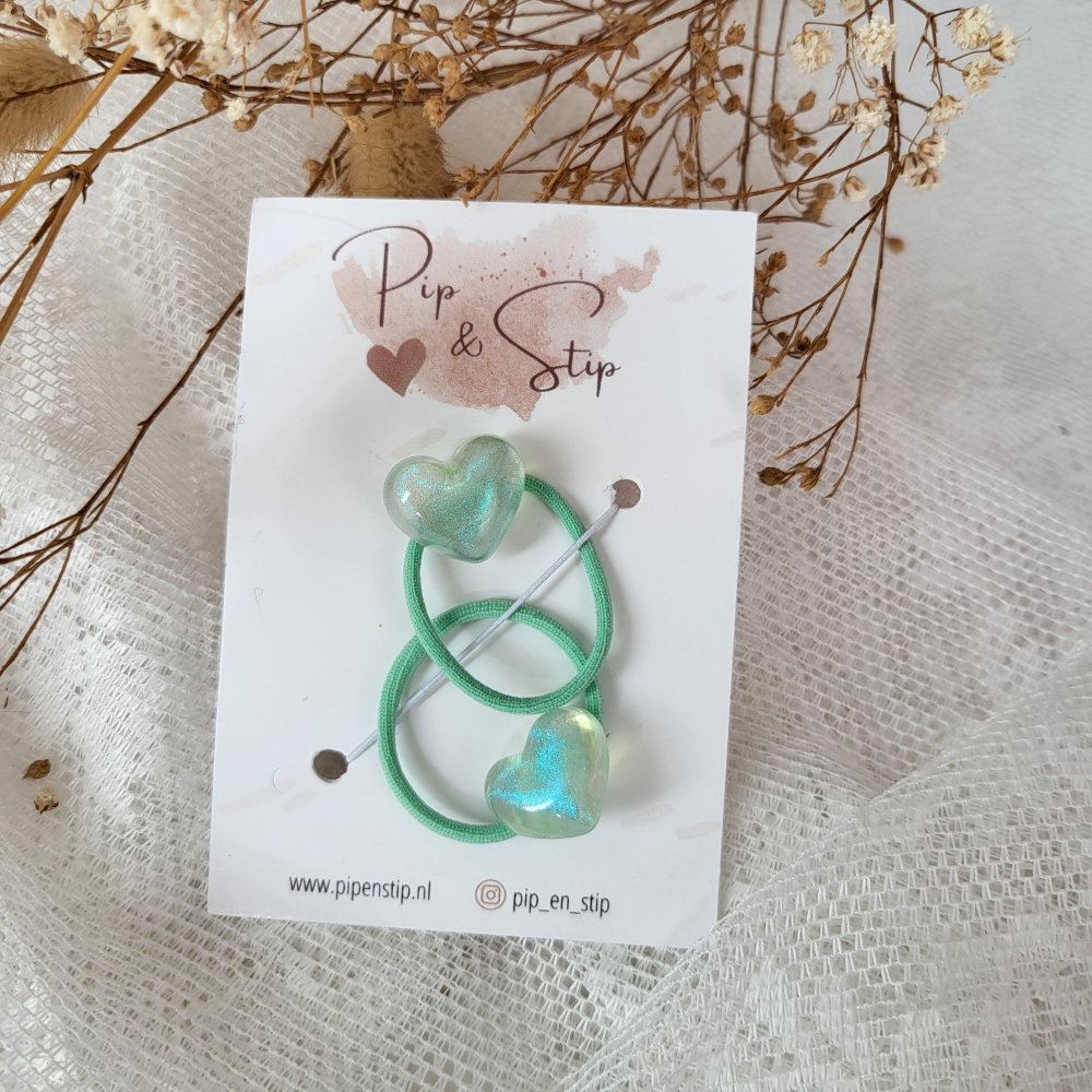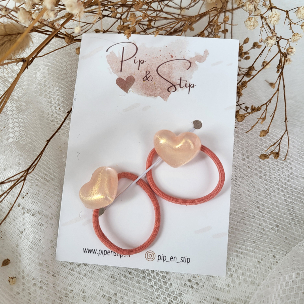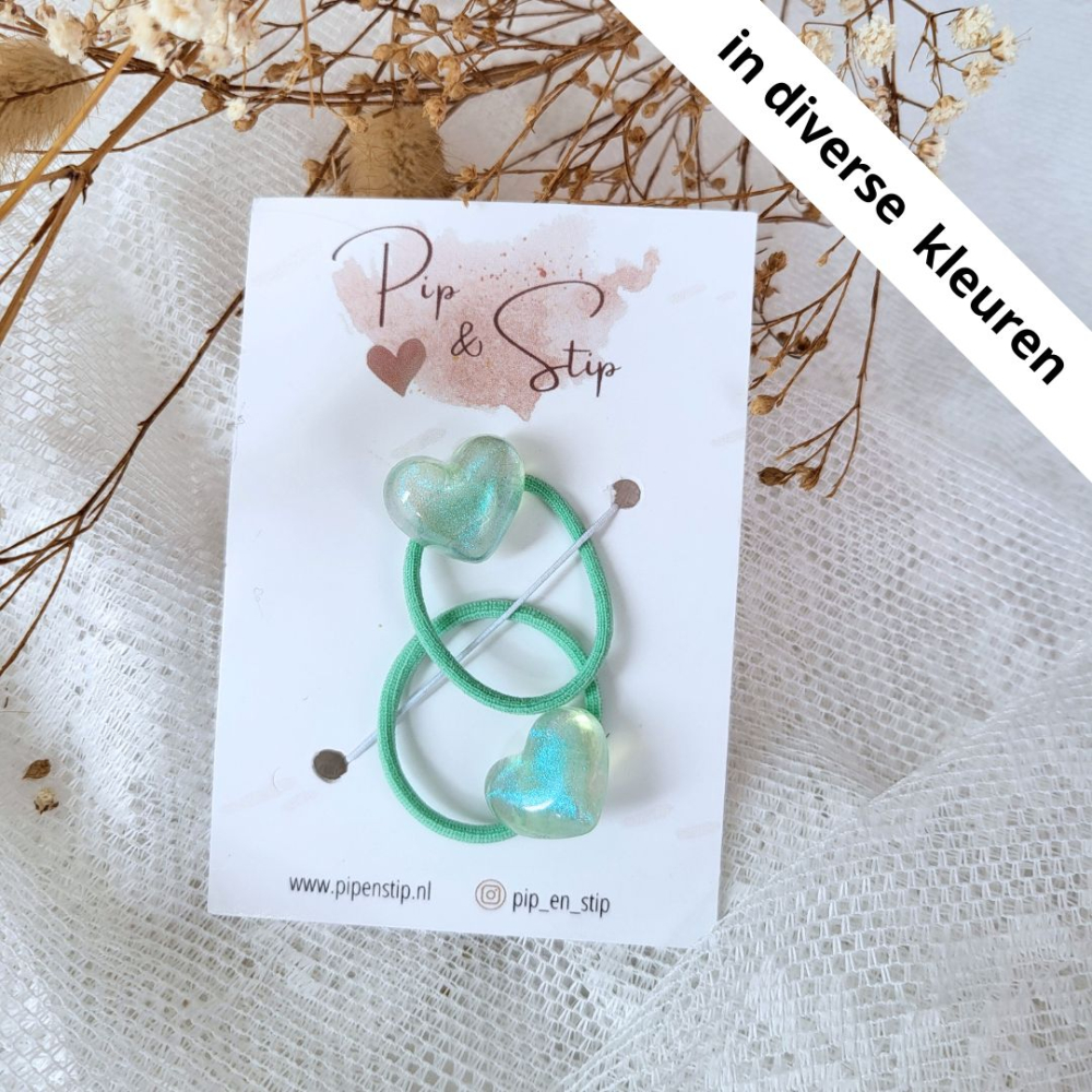 Setje van 2 haarelastiekjes met glanzend hartje.