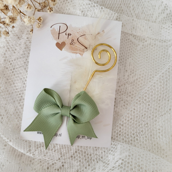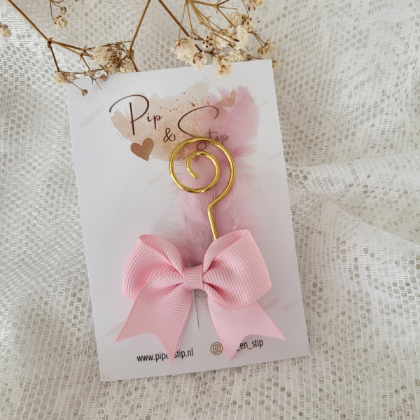 Een alligator speldjes met een Sint stafje en veertje op een strikje.