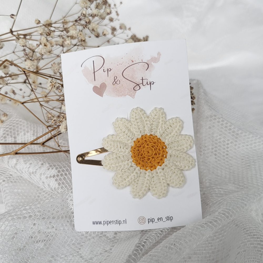 Je kan kiezen of je de bloem op een klikklak haarspeld wil, of op een alligator haarspeld.