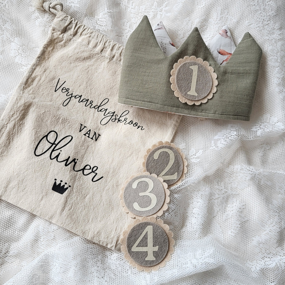 Ook kan je er een bewaarzakje voor de verjaardagskroon bij bestellen. Zo houd je alles bij elkaar voor de volgende verjaardag!