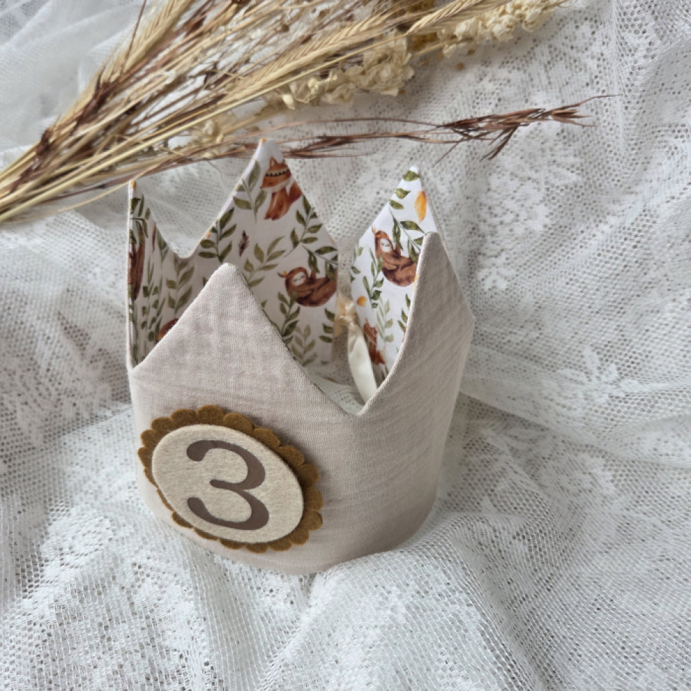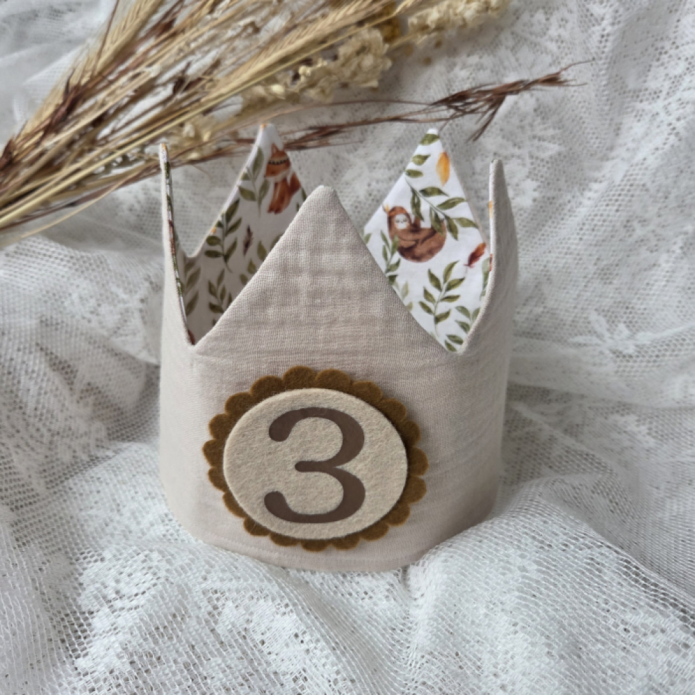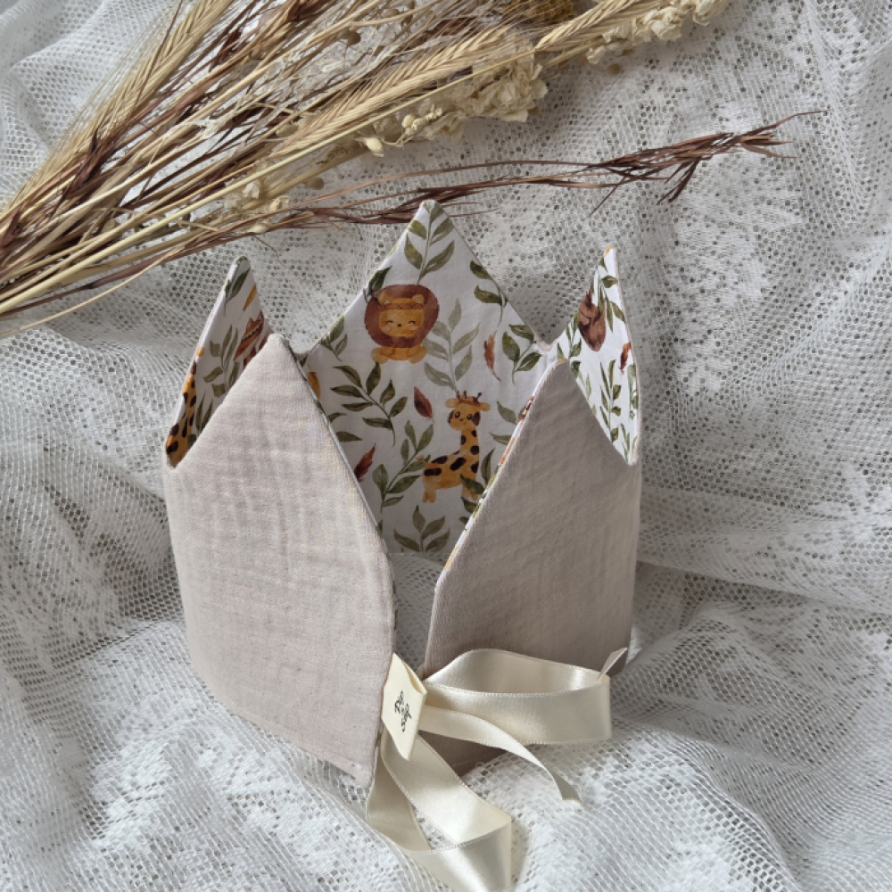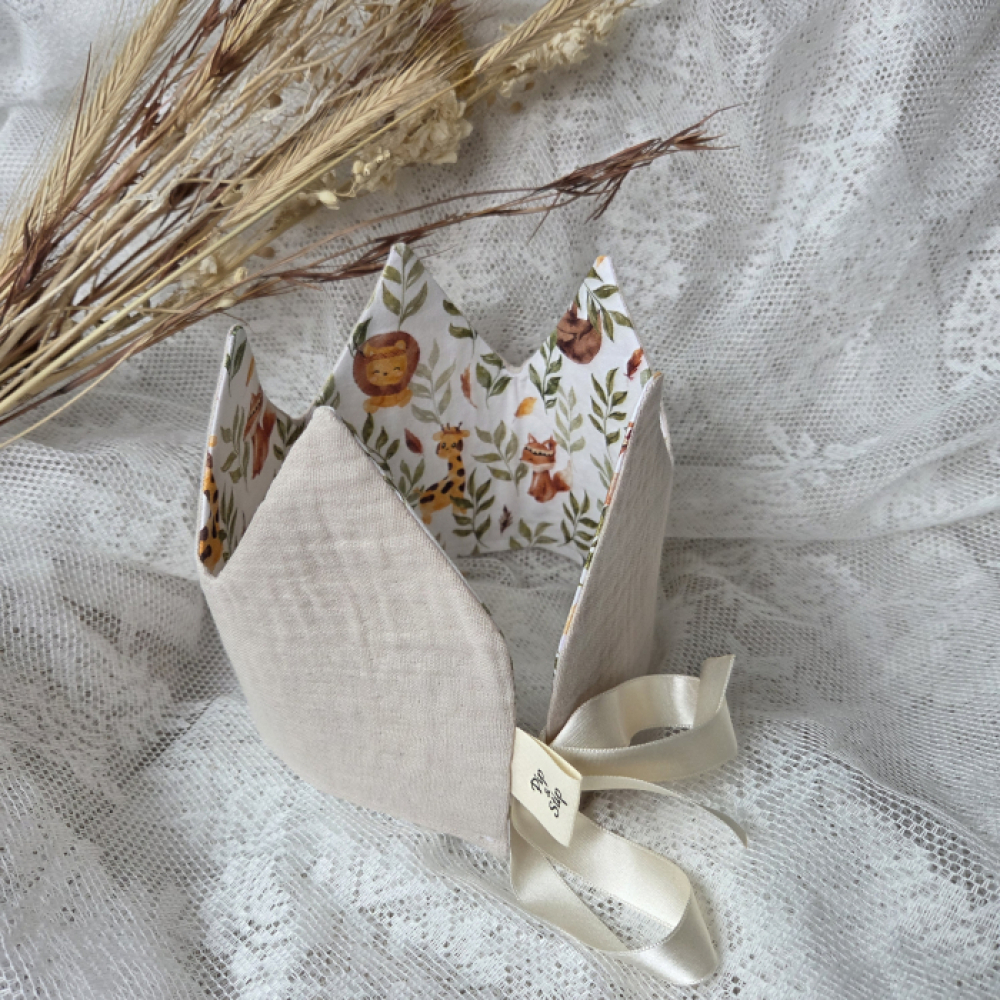 Deze vrolijke verjaardagskroon van hydrofiel stof zand (stof 14) en katoen dieren groen (stof 9) maakt het feest compleet!