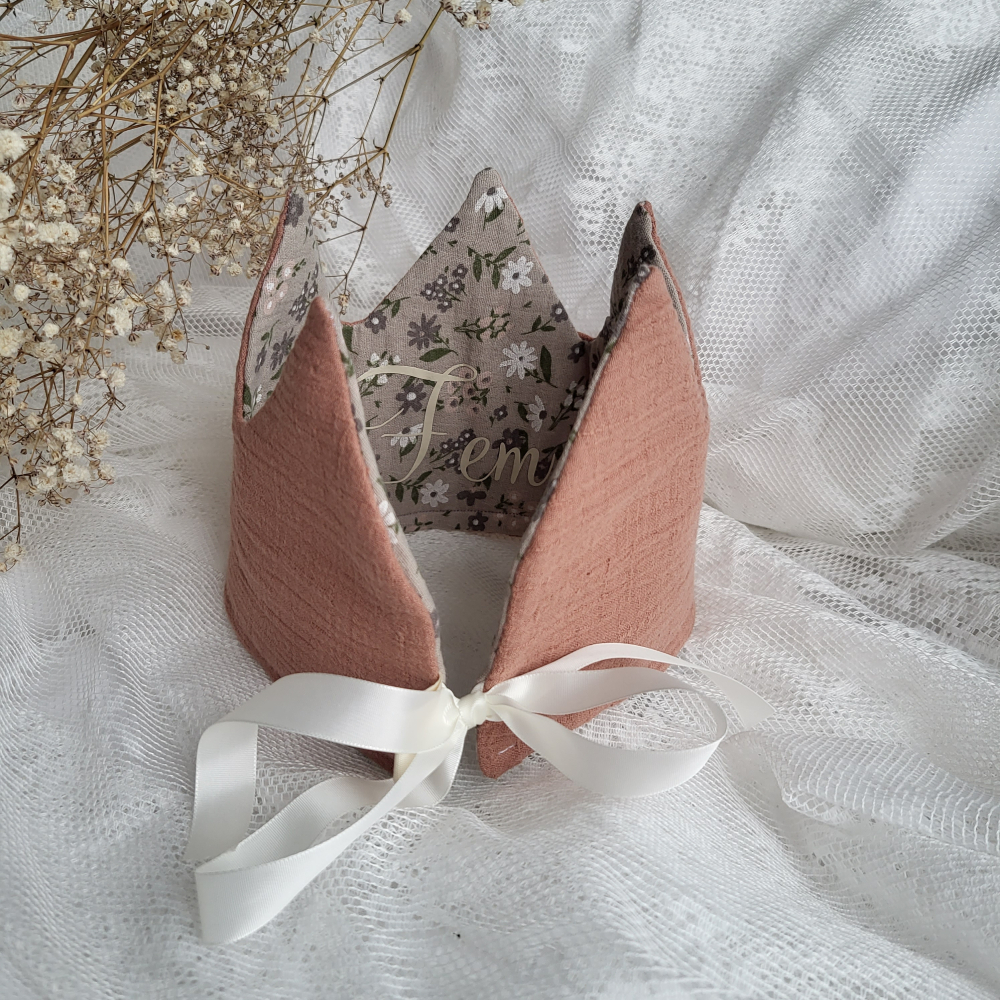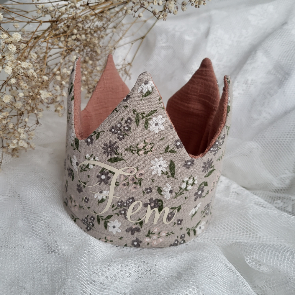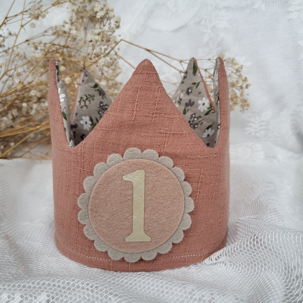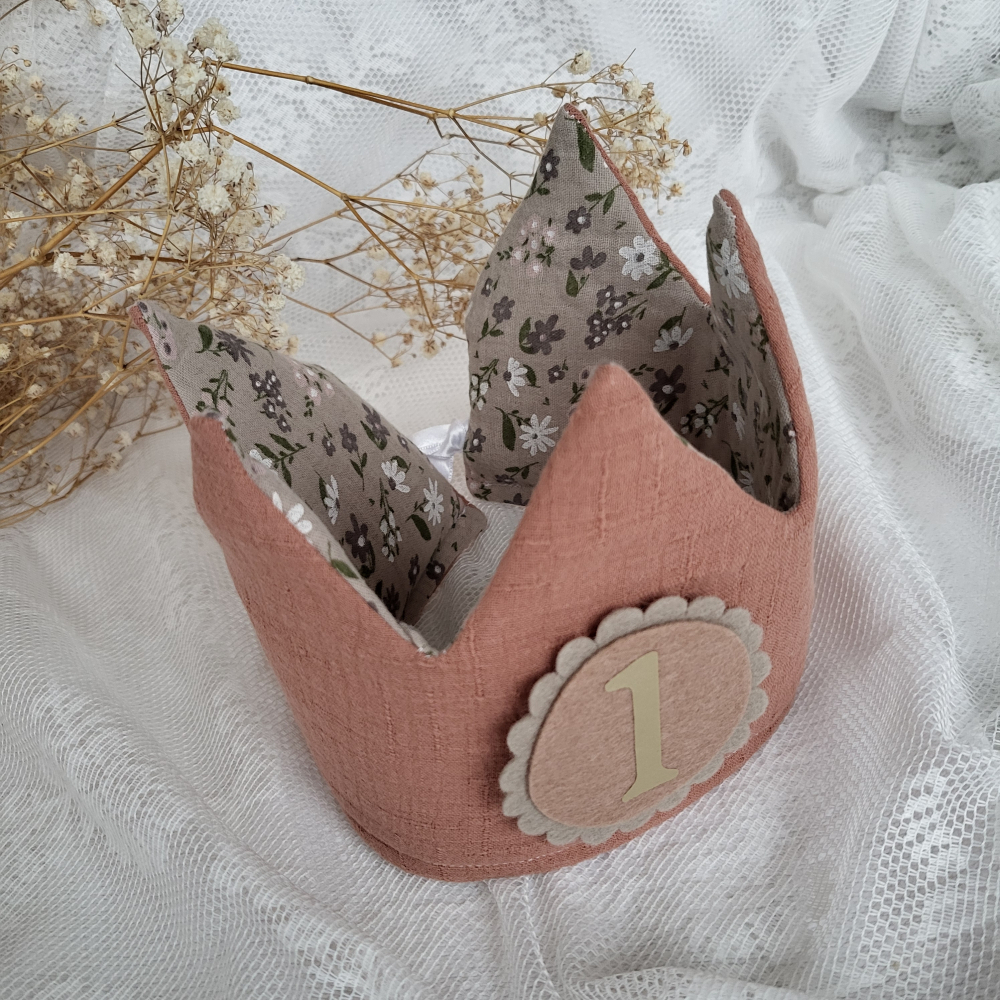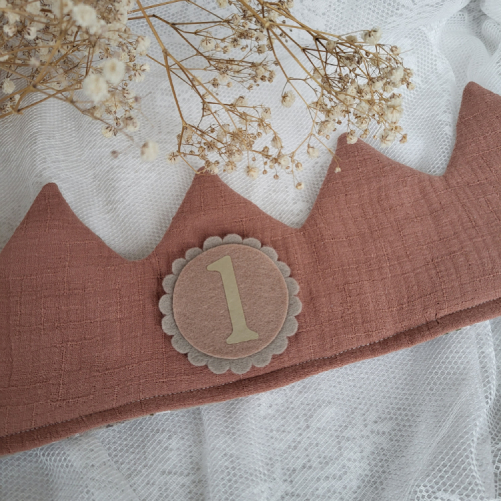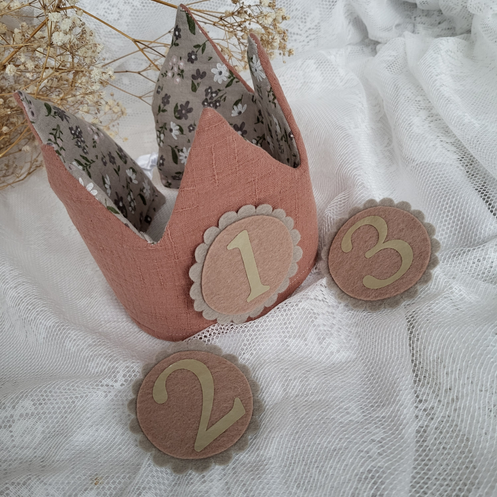 Deze vrolijke verjaardagskroon van bamboe stof oudroze (stof 16) en hydrofiel bloemetjes beige (stof 15) maakt het feest compleet!