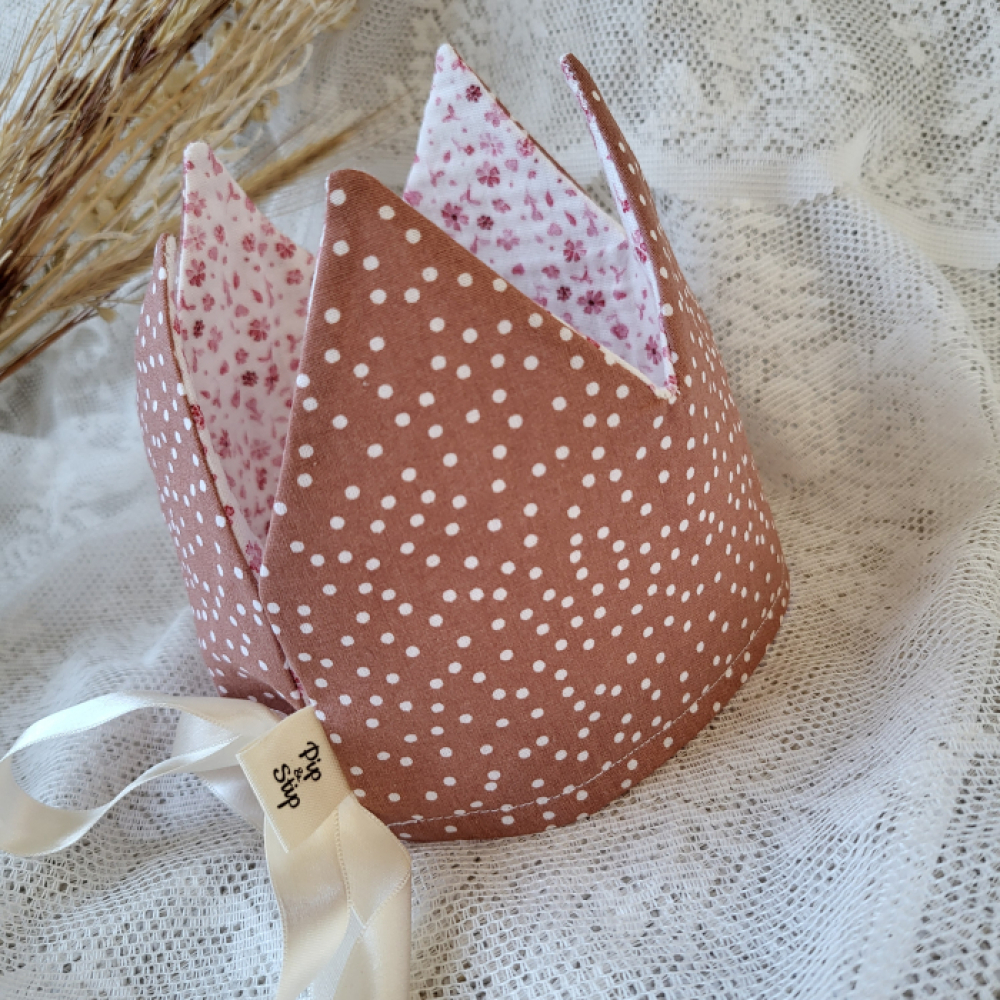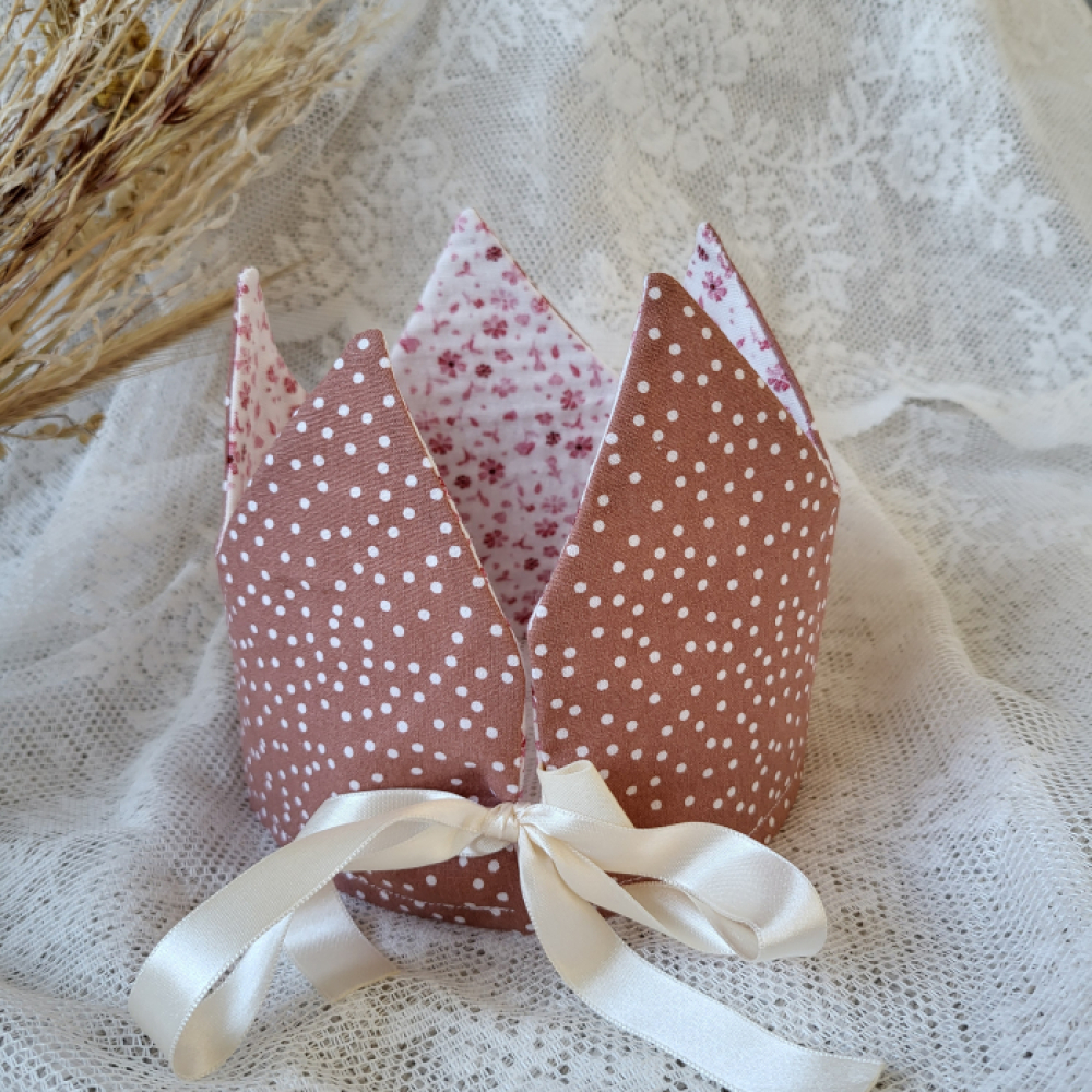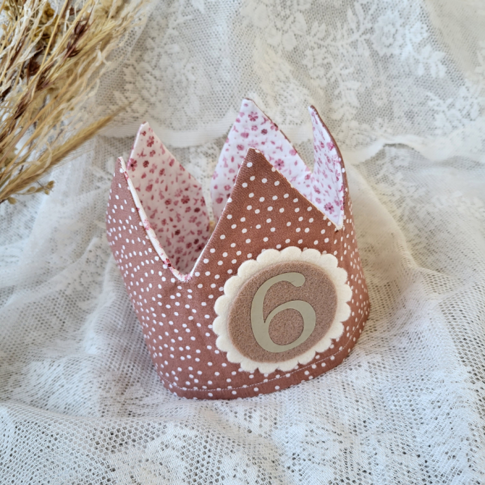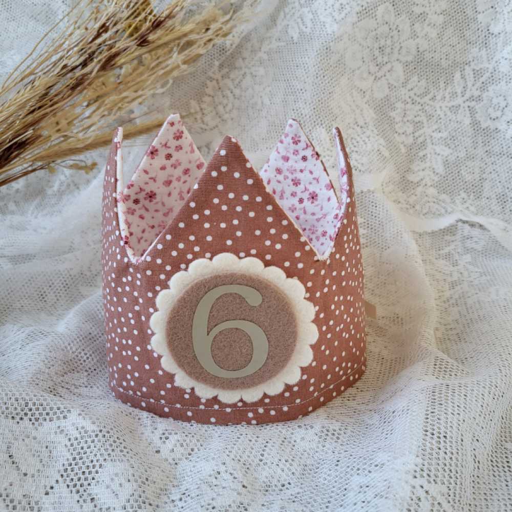 Deze vrolijke verjaardagskroon van katoen roze/terracotta (stof 31) en hydrofiel roze bloemetjes (stof 29) maakt het feest compleet!