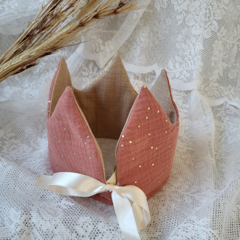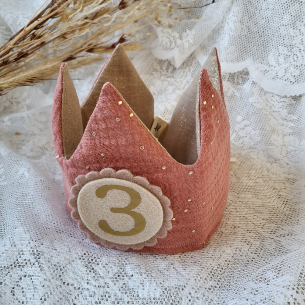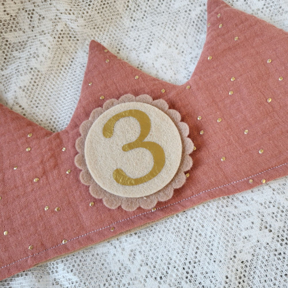 Deze vrolijke verjaardagskroon van hydrofiel terra roze met gouden studs (stof 36) en hydrofiel beige goud (stof 18) maakt het feest compleet!