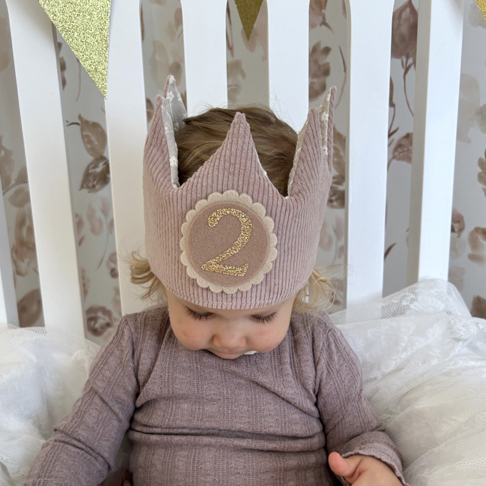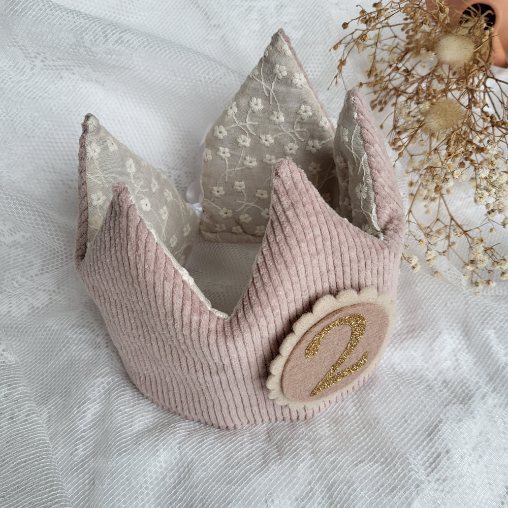 Deze vrolijke verjaardagskroon van rib stof licht oudroze (stof 23) en broderie ecru (stof 2) maakt het feest compleet!