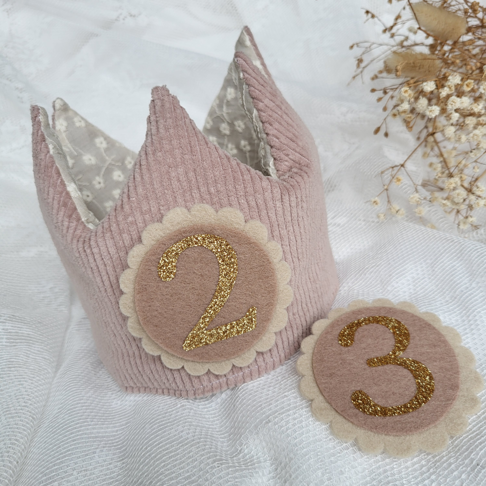 De rozetten (buitenrand licht beige kleur 3 en binnenkant oudroze kleur 6) met cijfers (kleur glitter goud 9) zijn verwisselbaar door middel van klittenband, en kan je er extra bijbestellen.