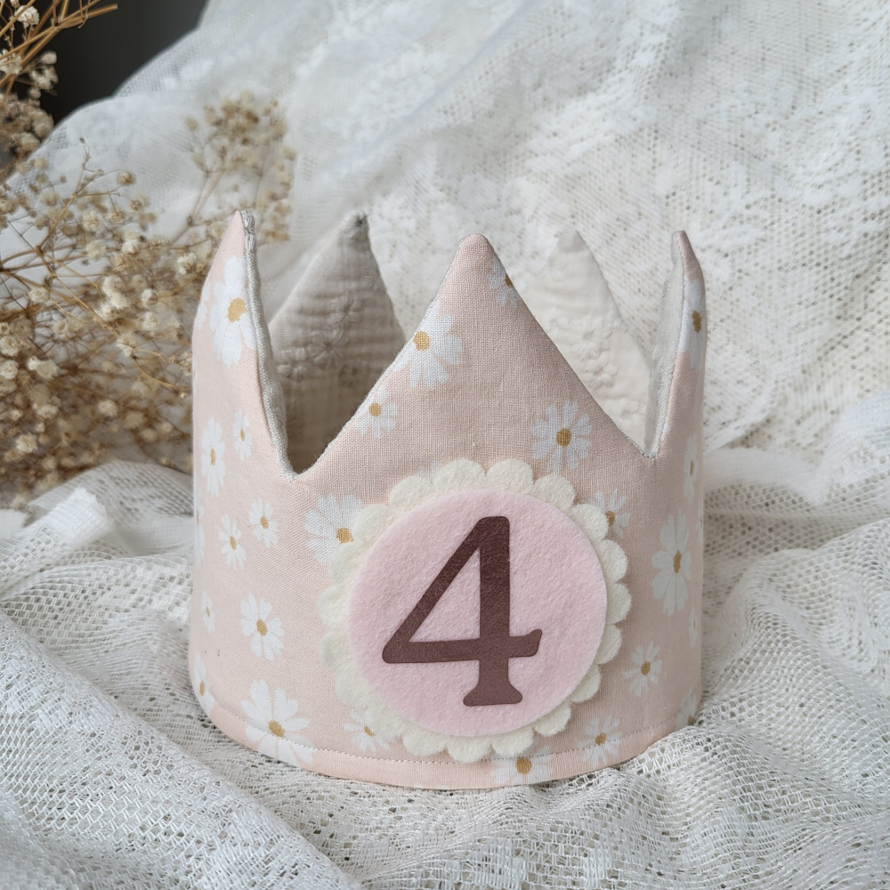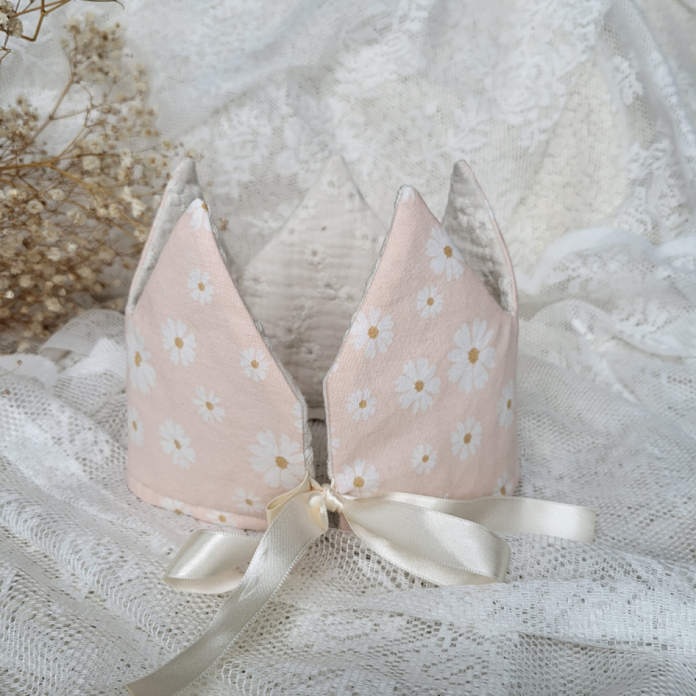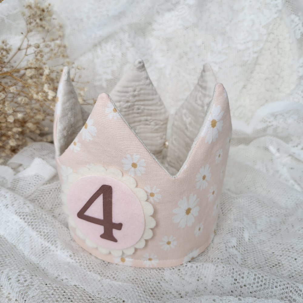 Deze vrolijke verjaardagskroon van katoen madeliefjes (stof 33) en broderie creme (stof 1) maakt het feest compleet!