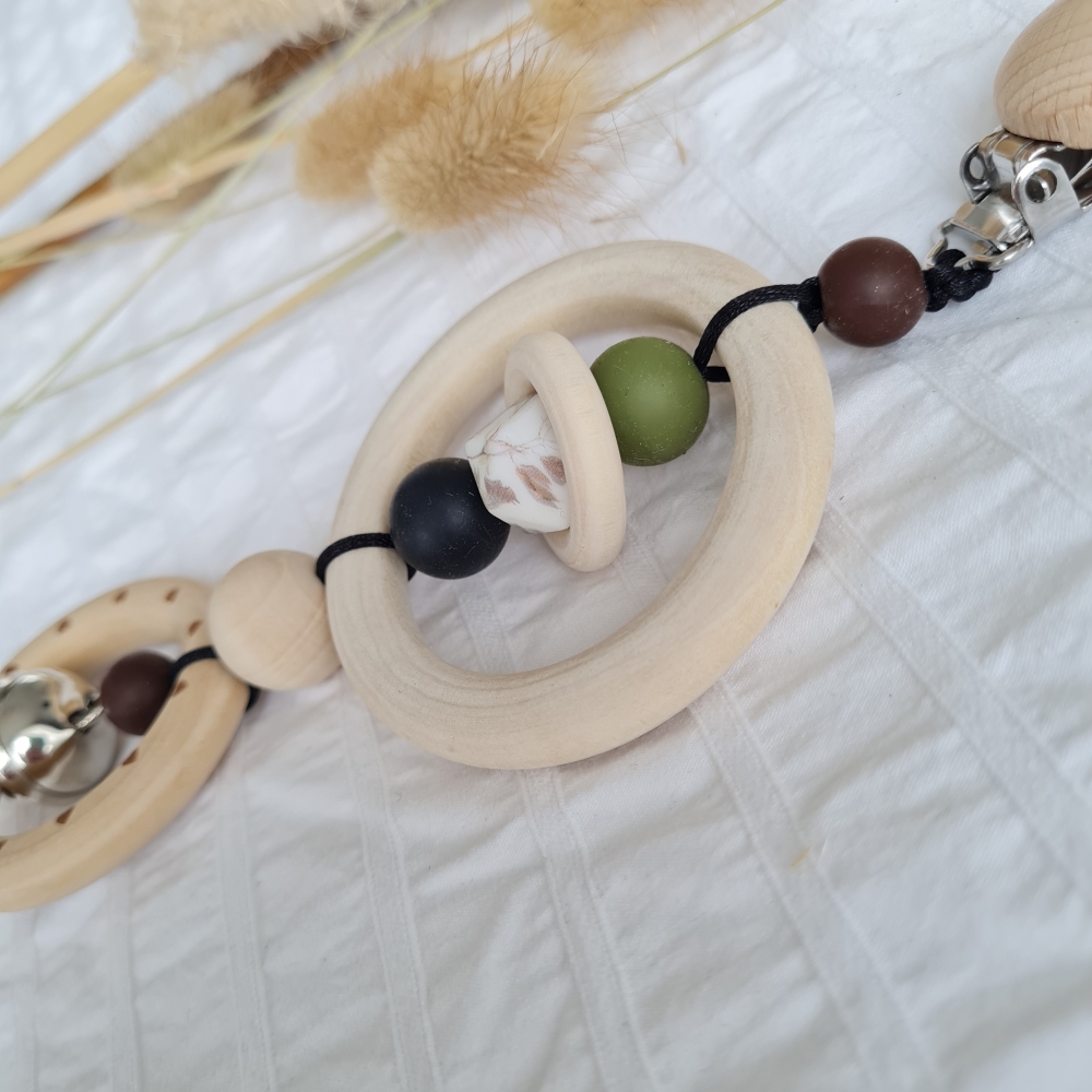 Kleurrijke rammelaar van silicone en houten kralen met een belletje om aan de kinderwagen, maxi cosi, Stokke Tripp Trapp of box te hangen.