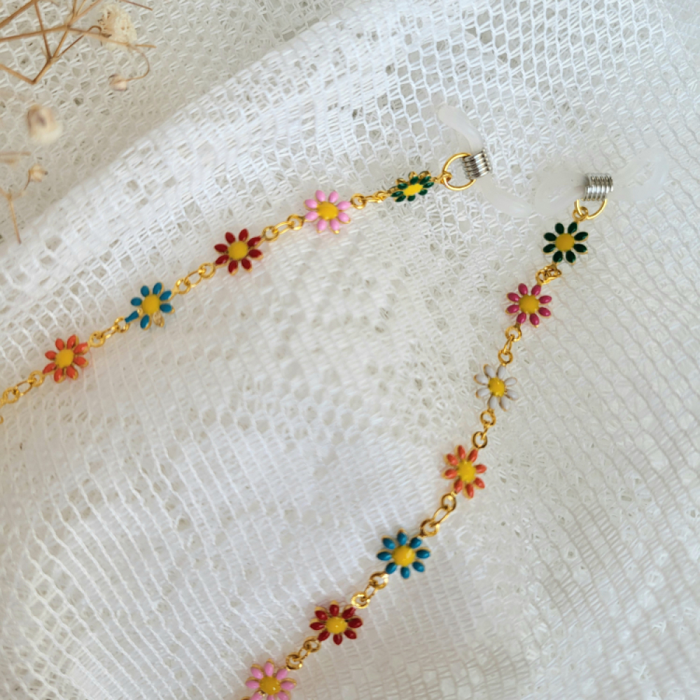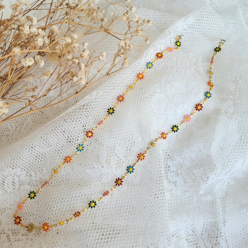 Super leuk zonnebrilkoord met bloemetjes! En ook nog eens hamdig! Zo blijft hij mooi om de nek van je kindje hangen en raakt ie niet kwijt of valt op de grond. Het koord is zo'n 50 cm lang.